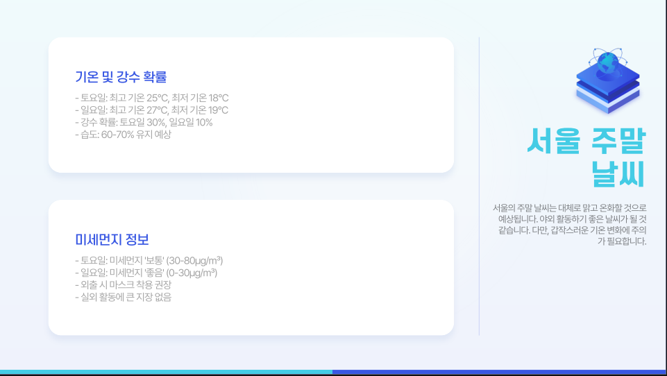 다가오는 주말, 외출이나 여행을 앞두고 있다면 반드시 확인해야 할 것이 바로 전국 주말 날씨 예보입니다. 전국 주말 날씨 예보는 서울, 부산, 대구, 인천, 대전, 제주도 등 주요 도시의 기상 변화를 실시간으로 보여주며, 안전하고 효율적인 주말 계획에 꼭 필요한 정보입니다. 날씨에 따라 외출 준비가 완전히 달라질 수 있기 때문에, 전국 주말 날씨 예보를 통해 미리 확인하고 대비하는 습관이 중요합니다. 전국 주말 날씨 예보는 기온, 강수량, 미세먼지, 바람 등 다양한 요소를 분석해 실생활에 바로 활용할 수 있도록 도와줍니다. 지금 바로 전국 주말 날씨 예보를 확인하고 똑똑하게 주말을 준비해보세요!