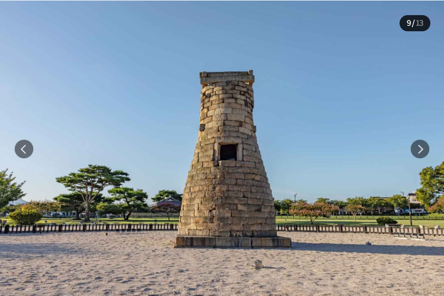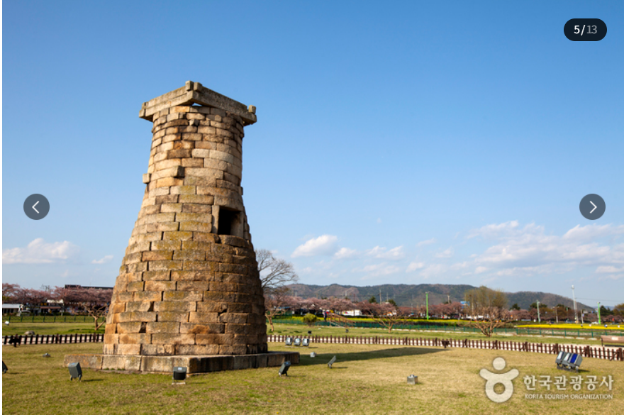 첨성대는 동양에서 가장 오래된 천문대로, 신라 선덕여왕 시기인 7세기에 건립된 것으로 알려져 있습니다. 365개의 돌로 구성된 원통형 구조는 1년 365일을 상징하며, 하늘을 관측하던 고대 과학의 결정체로 평가받습니다.