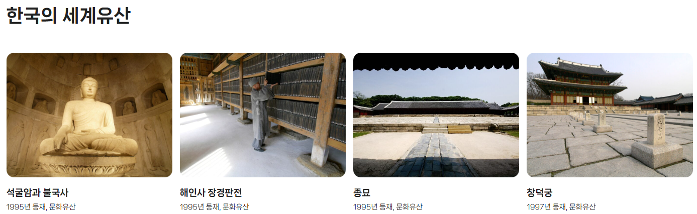 2025년 기준, 대한민국은 유네스코 세계유산으로 다음과 같은 15건을 보유하고 있습니다.