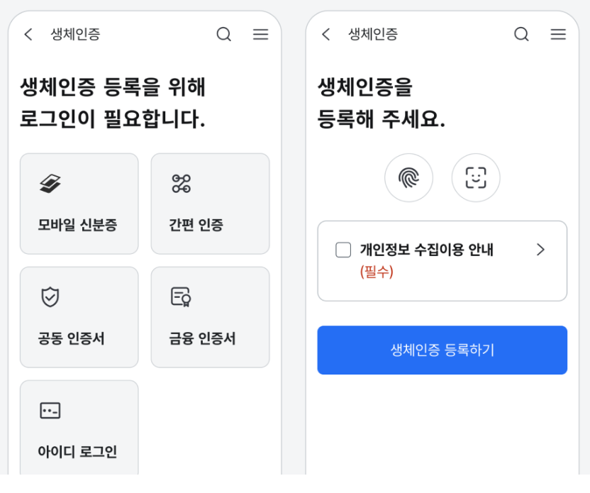 | 로그인 | 간편인증 앱 연동 (지문/비밀번호) |